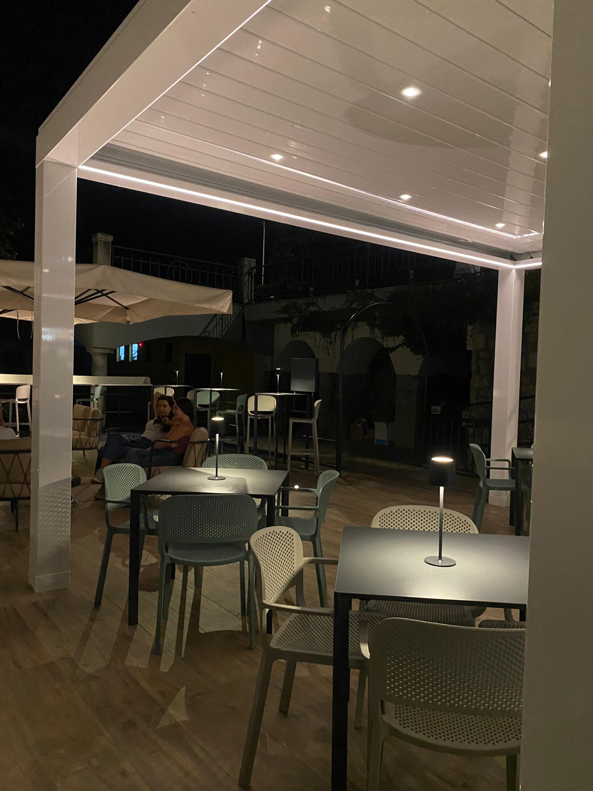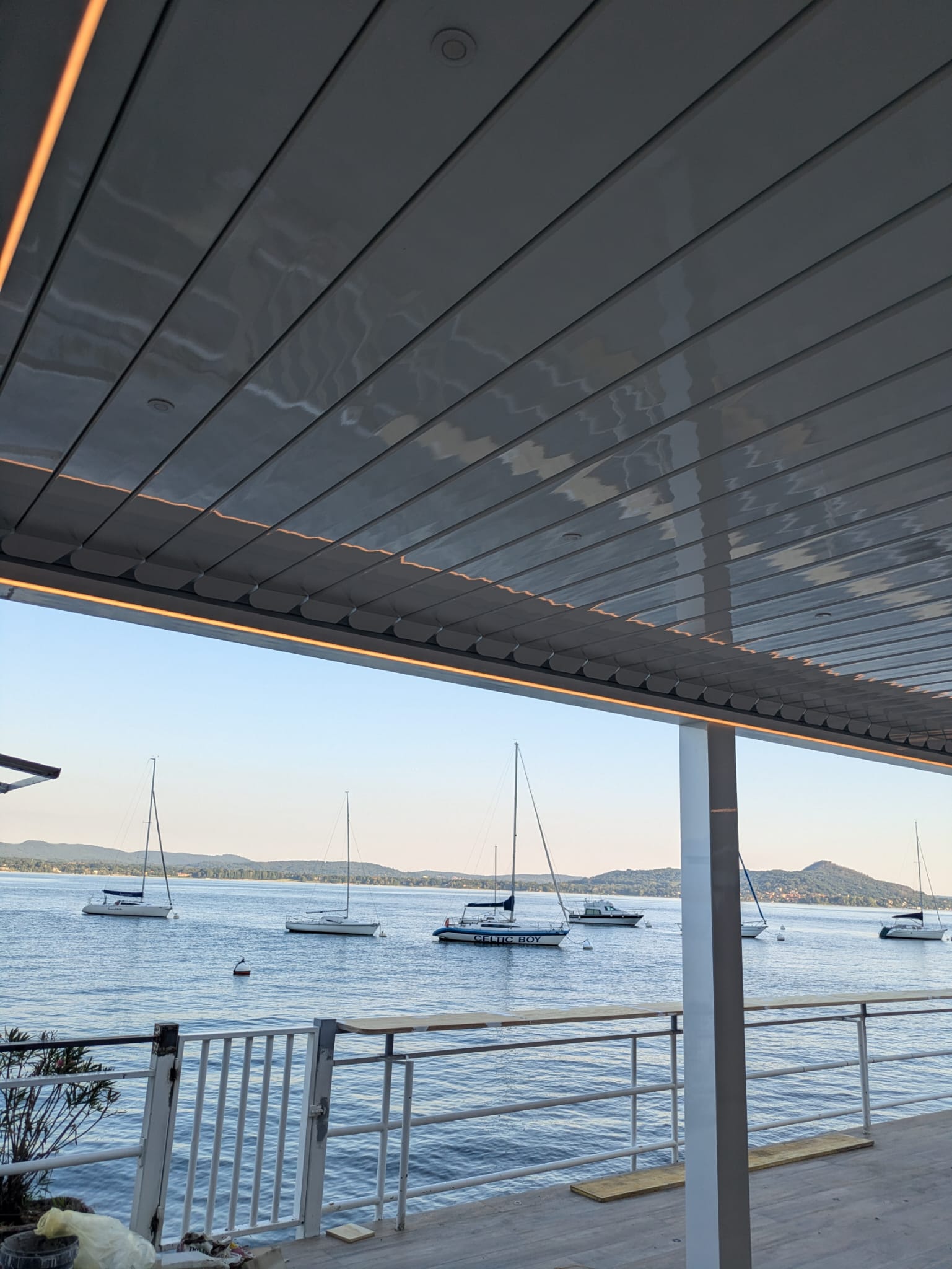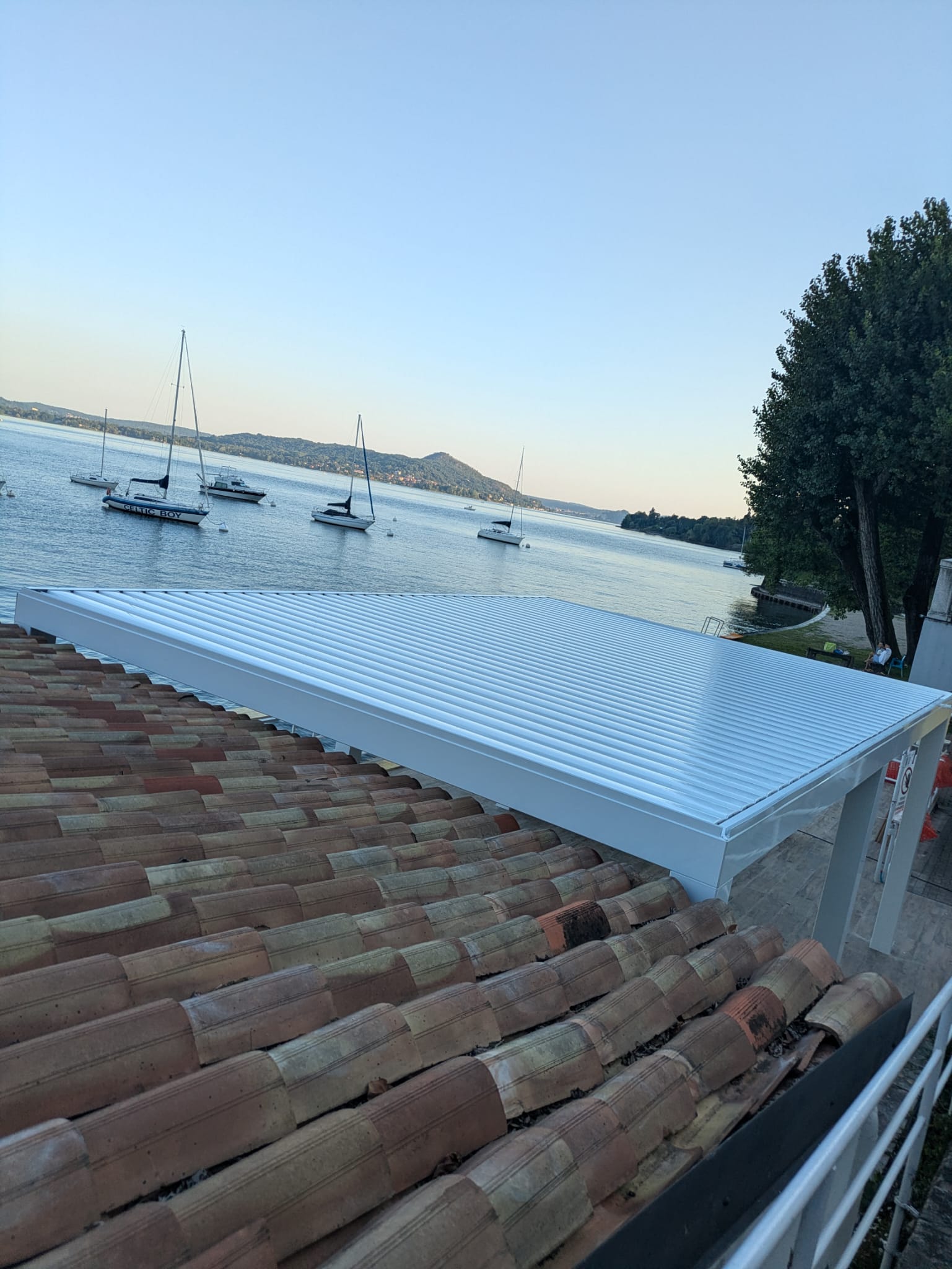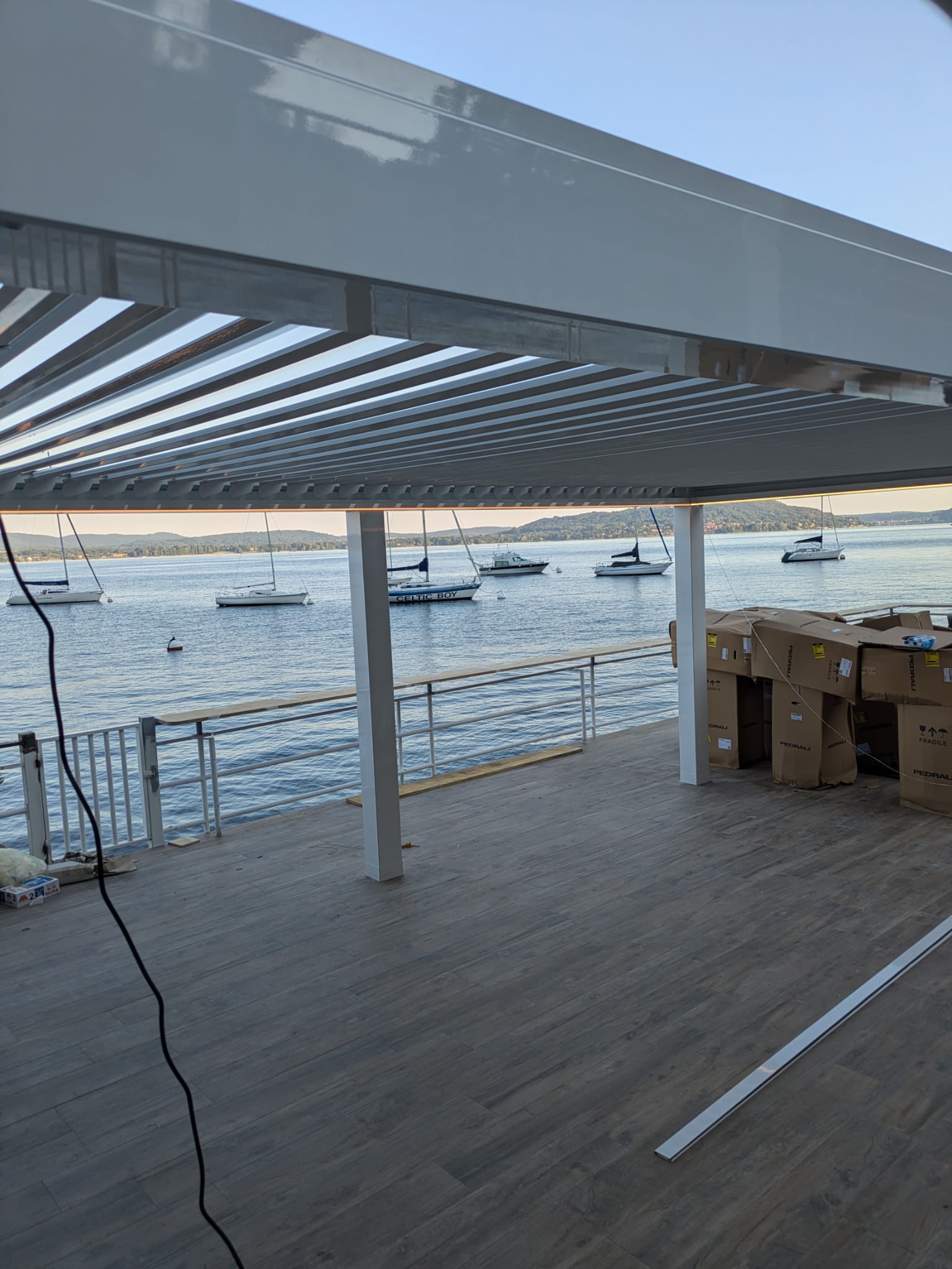 La pavimentazione in doghe effetto legno dialoga con il bianco essenziale della pergola bioclimatica, elegante e funzionale grazie alle lamelle orientabili e alle luci integrate, che rendono lo spazio vivibile in ogni stagione. Lungo il parapetto, un bancone alto panoramico permette di sorseggiare un drink ammirando le barche ormeggiate e i tramonti sul lago.