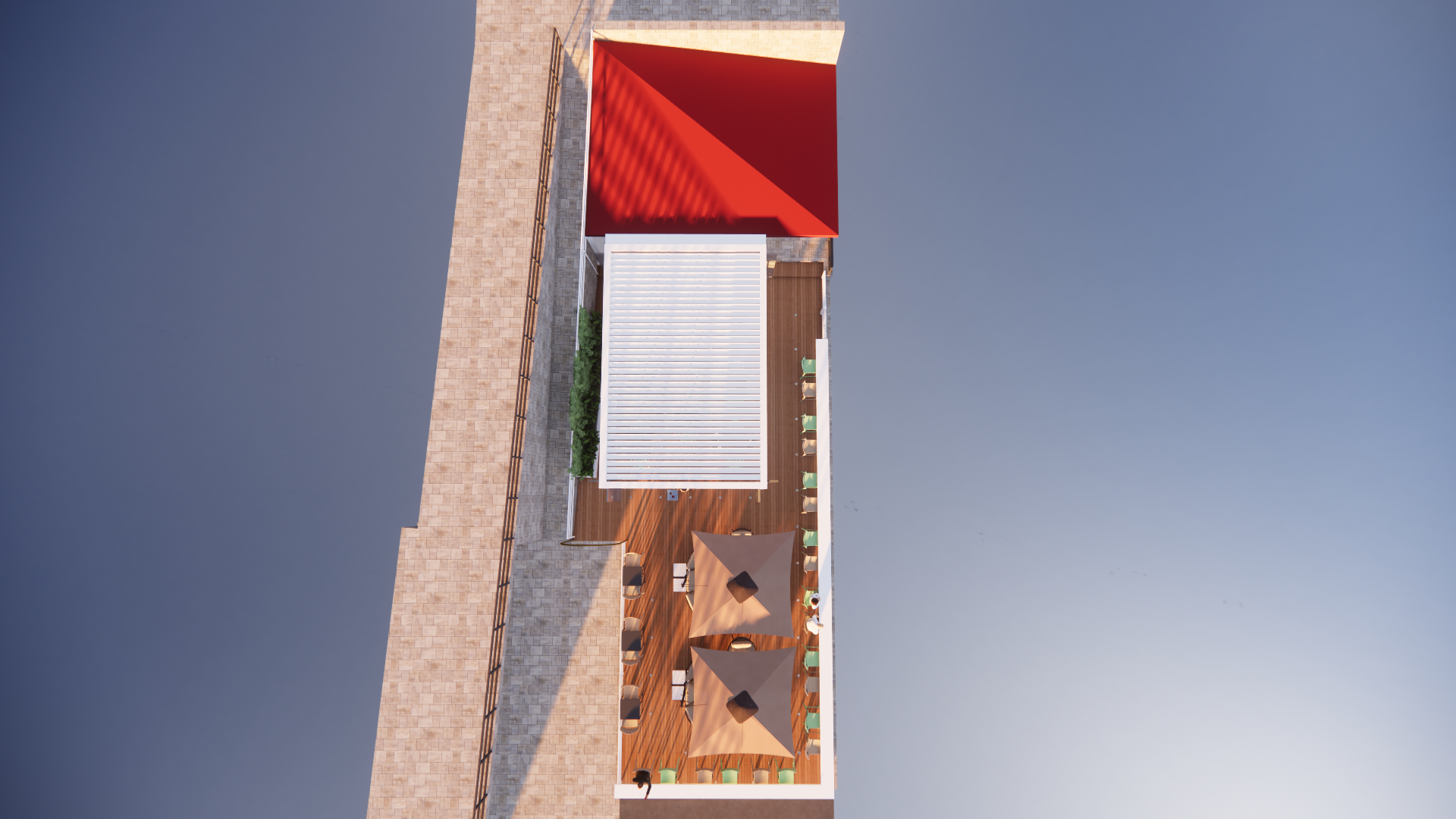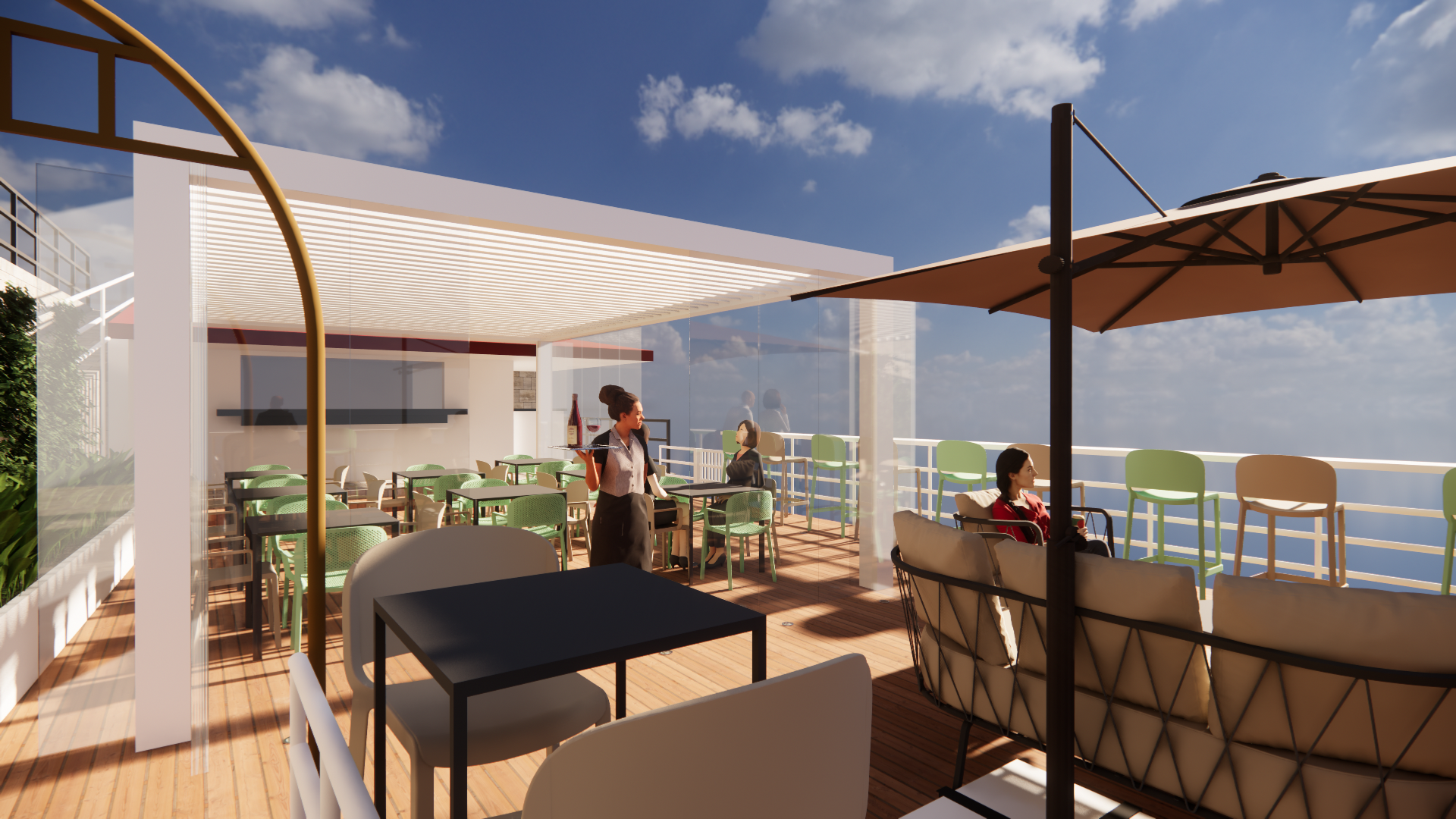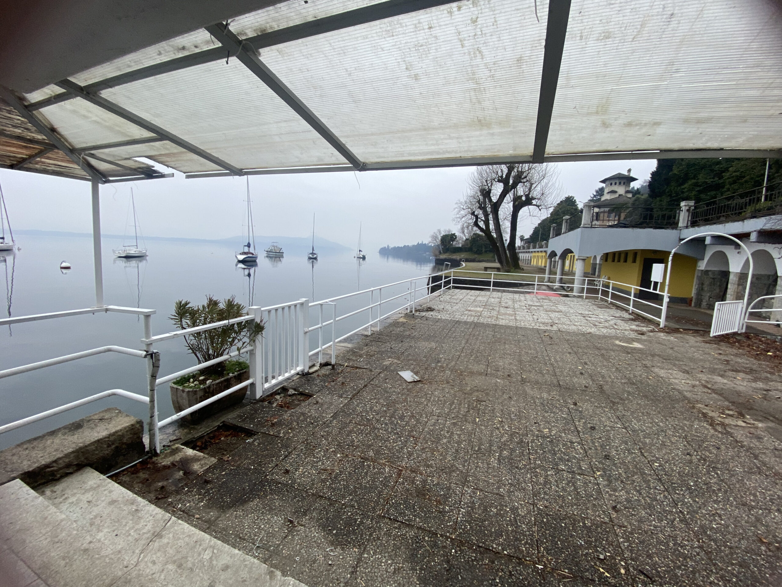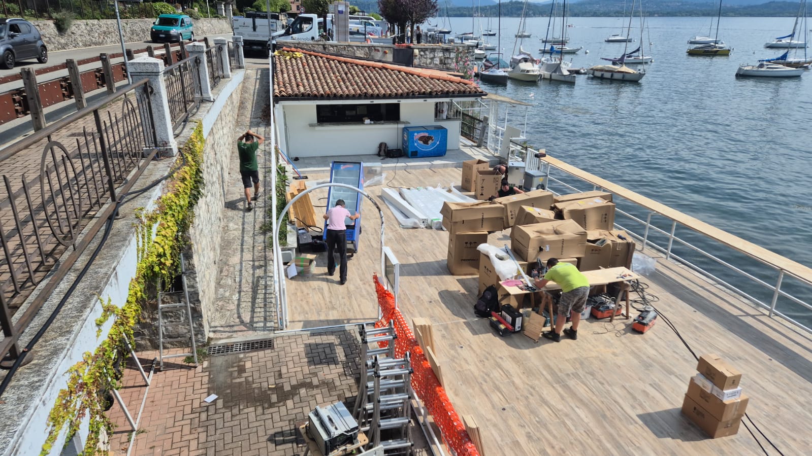 La pavimentazione in doghe effetto legno dialoga con il bianco essenziale della pergola bioclimatica, elegante e funzionale grazie alle lamelle orientabili e alle luci integrate, che rendono lo spazio vivibile in ogni stagione. Lungo il parapetto, un bancone alto panoramico permette di sorseggiare un drink ammirando le barche ormeggiate e i tramonti sul lago.
