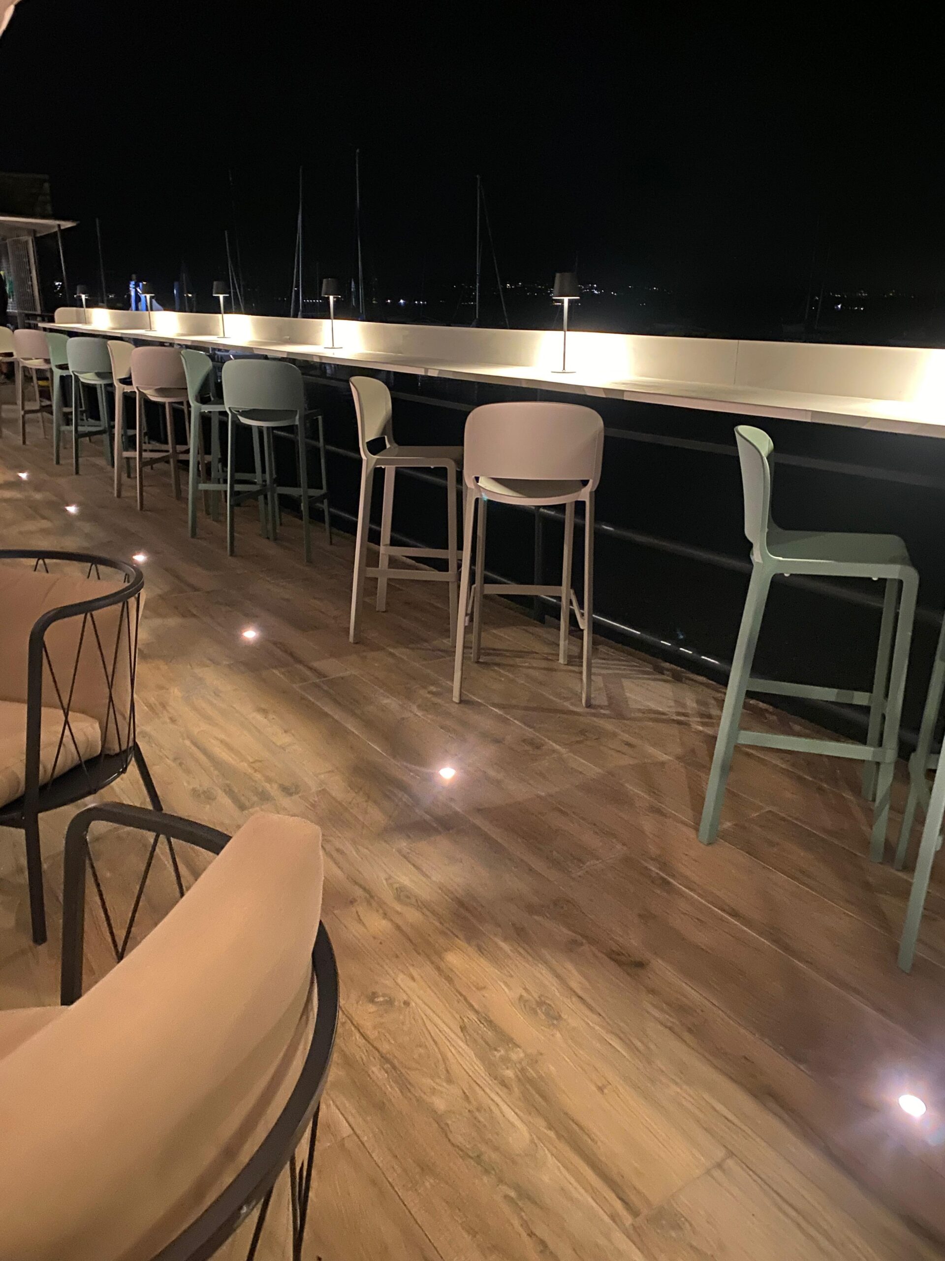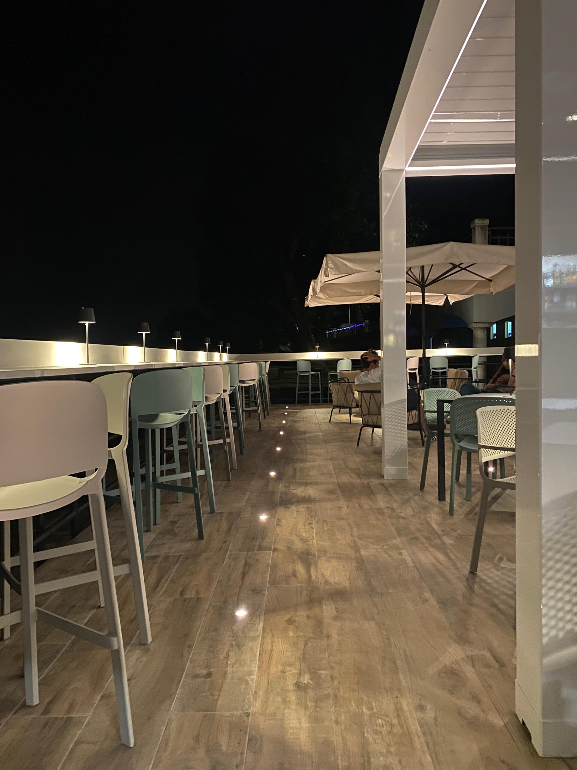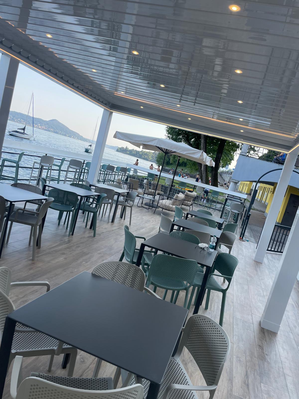 Di giorno, la luce riflessa sull’acqua regala trasparenze uniche. Di sera, la luna sul lago e le luci soffuse del locale creano un’atmosfera intima e incantevole, ideale per sorseggiare un cocktail in relax.