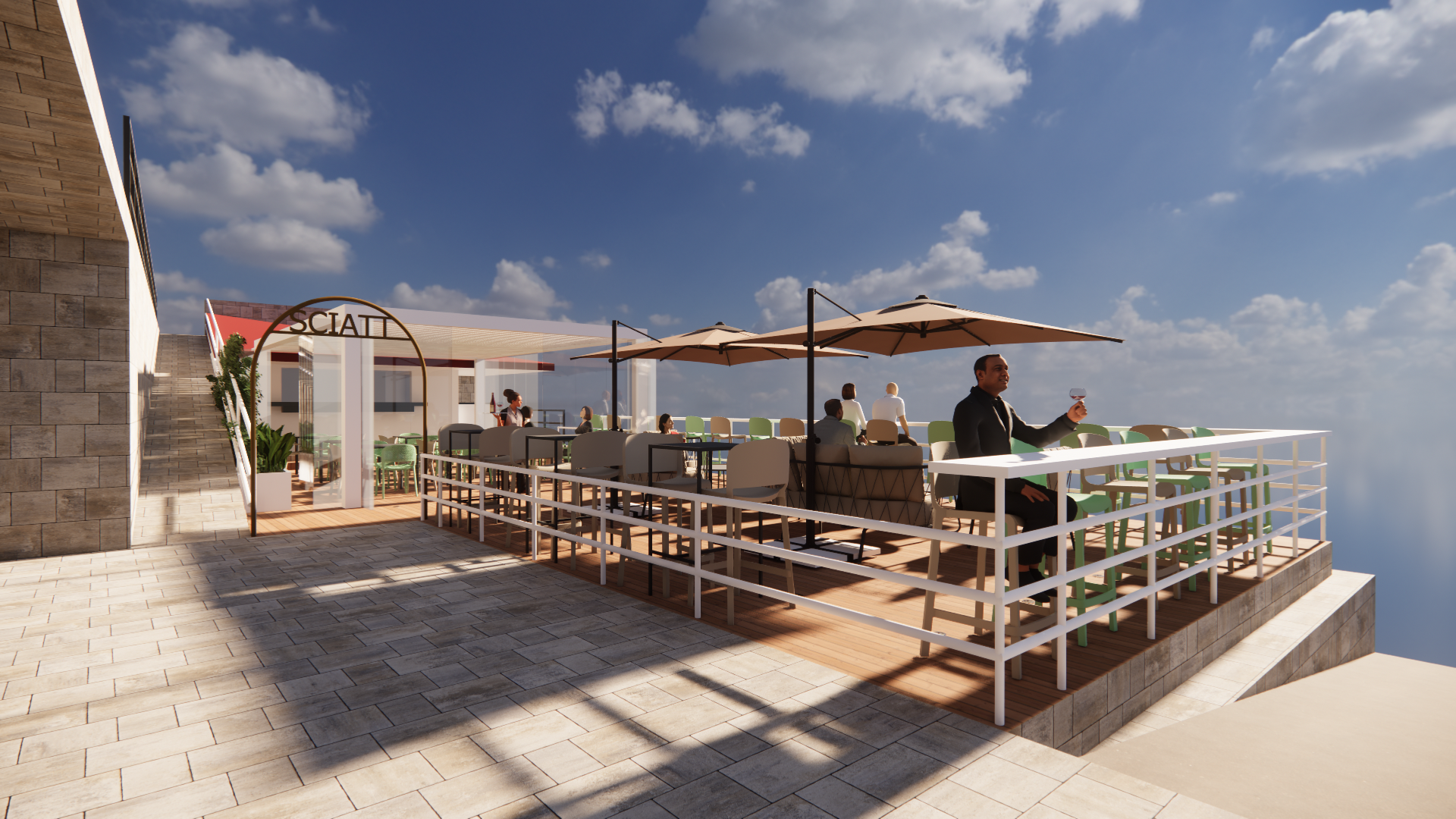 La palette cromatica – legno caldo, bianco luminoso e antracite raffinato – evoca il mondo nautico e trasforma la terrazza in un vero e proprio ponte sospeso sull’acqua. Il nome Sciatt, che in dialetto locale significa “rospo” e richiama due storiche imbarcazioni ormeggiate di fronte, sigilla il legame del locale con il territorio.